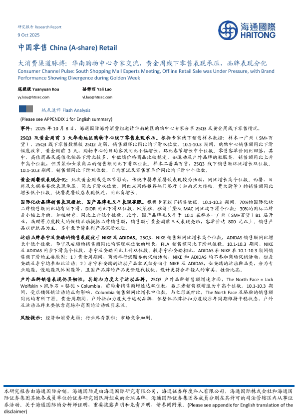 【海通国际】【202510】大消费渠道脉搏:华南购物中心专家交流,黄金周线下零售表现承压,品牌表现分化-8页