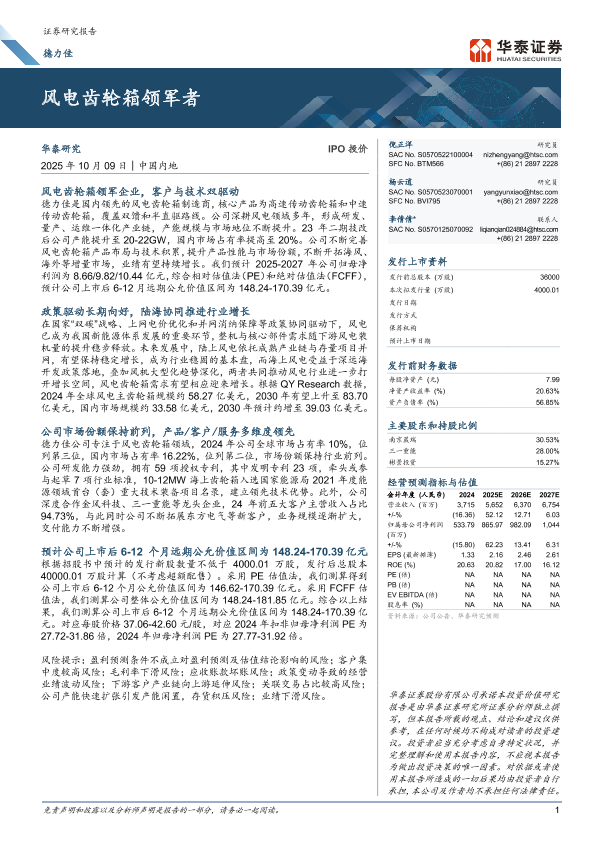 【华泰证券股份有限公司】【202510】德力佳-IPO投价:风电齿轮箱领军者-52页