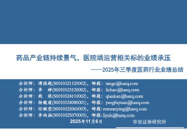 【华安证券】【202511】2025年三季度医药行业业绩总结:药品产业链持续景气,医院端运营相关标的业绩承压-70页