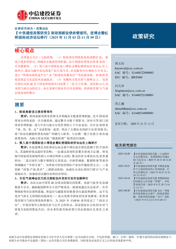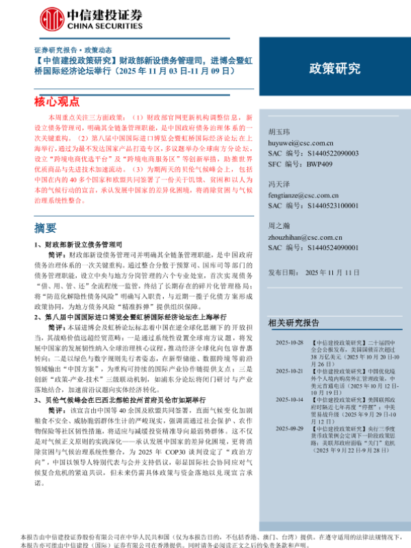 【中信建投证券】【202511】【中信建投政策研究】财政部新设债务管理司,进博会暨虹桥国际经济论坛举行(2025年11月03日-11月09日)-15页