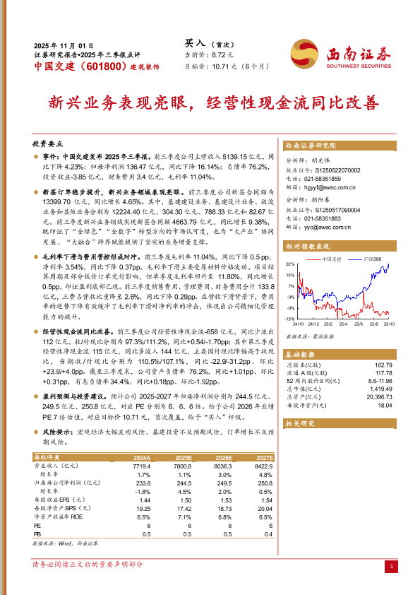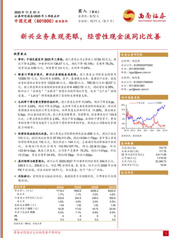 【西南证券】【202510】中国交建2025年三季报点评:新兴业务表现亮眼,经营性现金流同比改善-11页