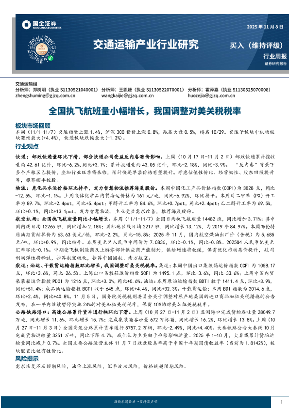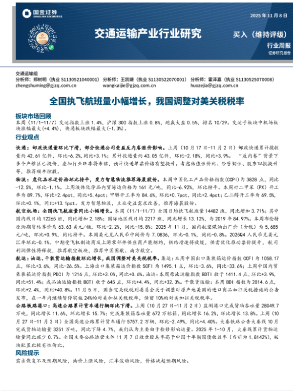【国金证券】【202511】交通运输产业行业研究:全国执飞航班量小幅增长,我国调整对美关税税率-17页