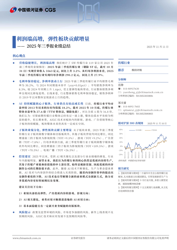 利润增长 AI赋能 子板块分化 三季报 传媒行业
