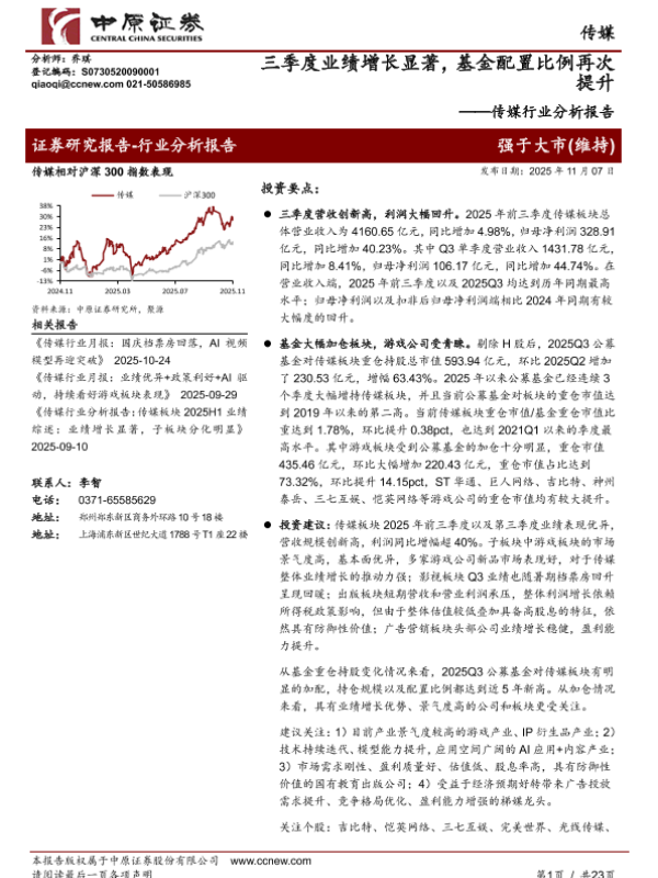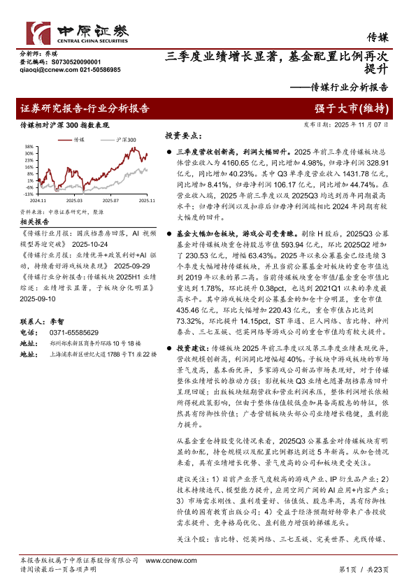 【中原证券】【202511】传媒行业分析报告:三季度业绩增长显著,基金配置比例再次提升-23页