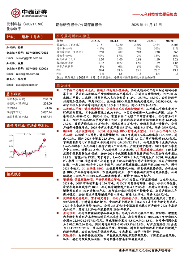 【中泰证券】【202511】元利科技(603217)首次覆盖报告:精细化工细分领域领军企业,多元业务协同打开新空间-25页
