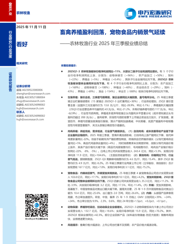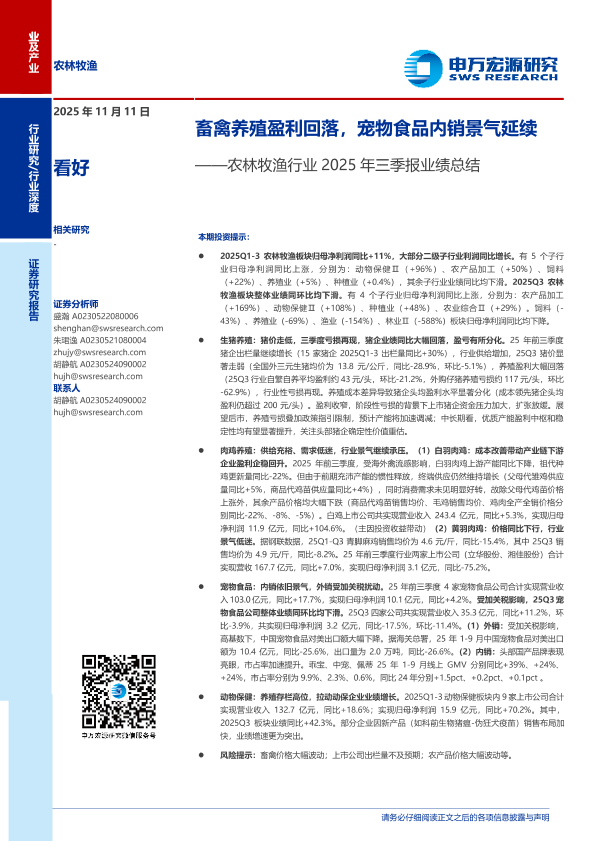 【申万宏源】【202511】农林牧渔行业2025年三季报业绩总结:畜禽养殖盈利回落,宠物食品内销景气延续-26页