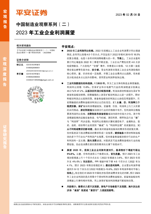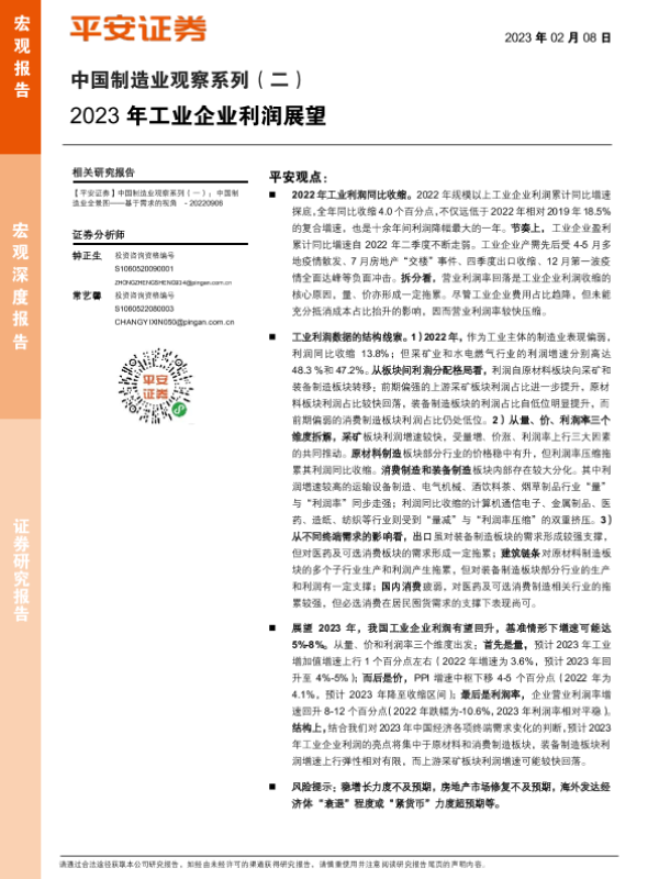 【平安证券】【20230208】中国制造业观察系列(二):2023年工业企业利润展望-15页