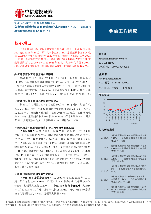【中信建投证券】【202511】分析师预期沪深300增强组合本月超额1.12%——分析师预期选股策略月报(2025年11月)-18页