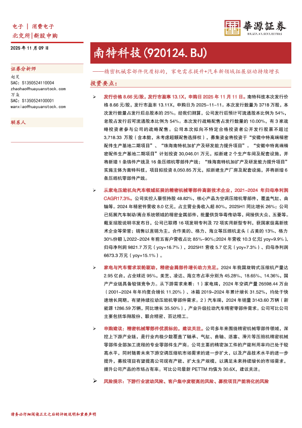 【华源证券】【202511】南特科技(920124.BJ)——精密机械零部件优质标的,家电需求提升+汽车新领域拓展驱动持续增长-17页