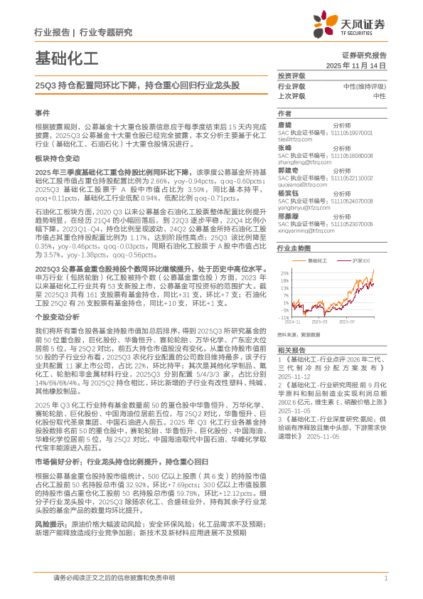 【天风证券】【202511】基础化工行业:25Q3持仓配置同环比下降,持仓重心回归行业龙头股-17页