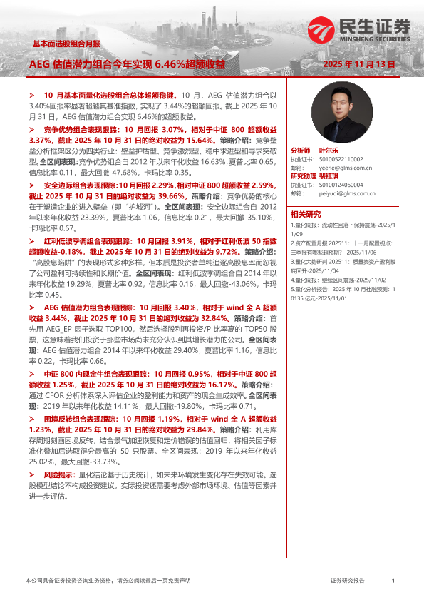 【民生证券】【202511】基本面选股组合月报:AEG估值潜力组合今年实现6.46%超额收益-18页