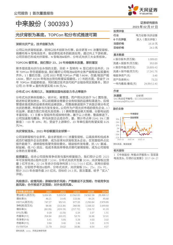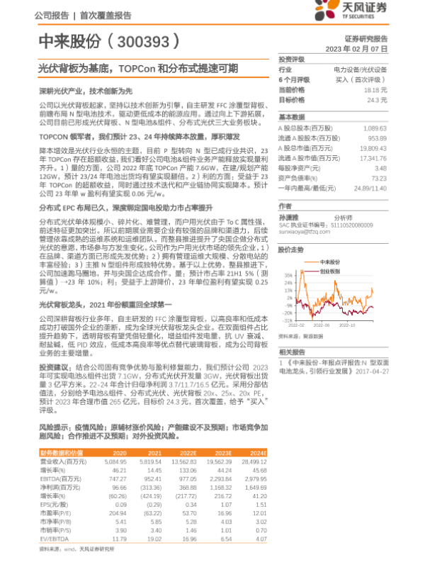 【天风证券】【20230207】中来股份(300393)光伏背板为基底,TOPCon和分布式提速可期-23页
