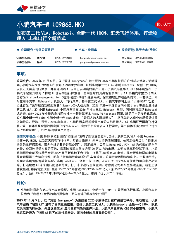 【国信证券】【202511】小鹏汽车-W(9868.HK)发布第二代VLA、Robotaxi、全新一代IRON、汇天飞行体系,打造物理AI未来出行全新范式-14页