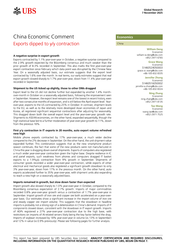 【UBS】【202511】China Economic Comment Exports dipped to y/y contraction-10页