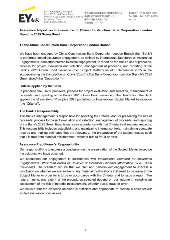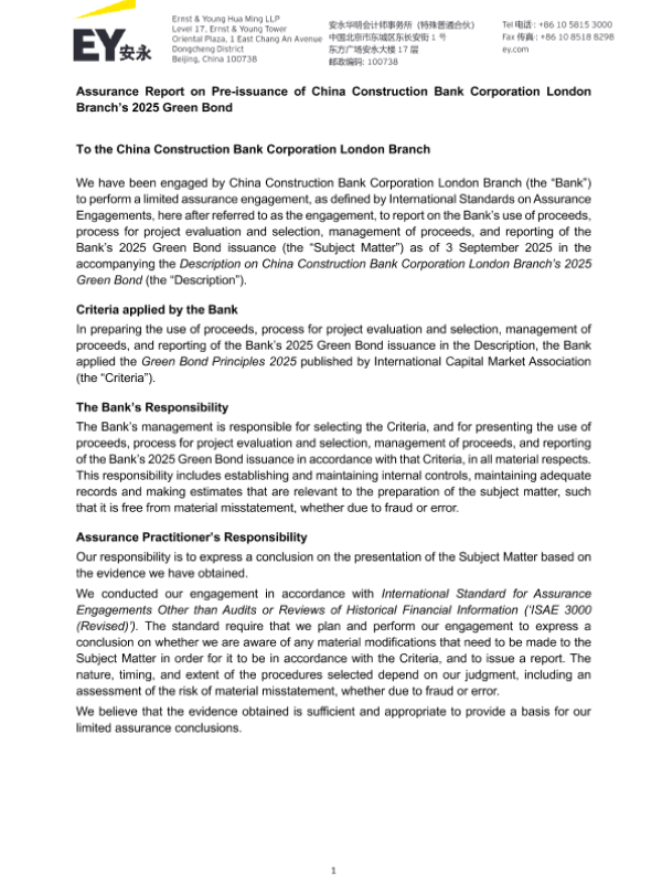 【安永华明会计师事务所(特殊普通合伙)】【202509】Assurance Report on Pre-issuance of China Construction Bank Corporation London Branch’s 2025 Green Bond-7页