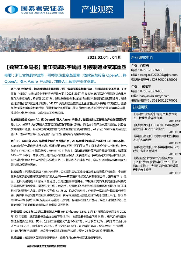 【国泰君安证券】【20230204】产业观察04期:【数智工业周报】浙江实施数字赋能 引领制造业变革重塑-16页