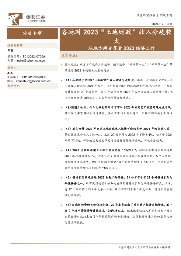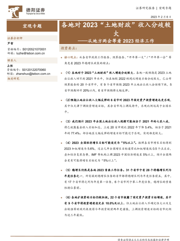 【德邦证券】【20230206】从地方两会等看2023经济工作:各地对2023“土地财政”收入分歧较大-21页