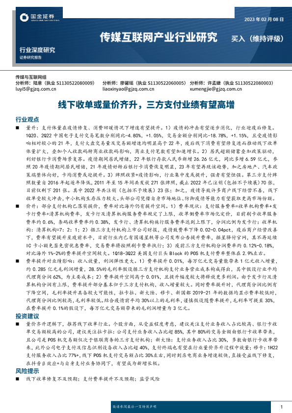 【国金证券】【20230208】传媒互联网产业行业深度研究:线下收单或量价齐升,三方支付业绩有望高增-19页