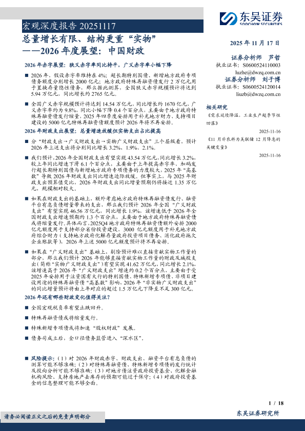 【东吴证券】【202511】2026年度展望:中国财政,总量增长有限、结构更重“实物”-18页