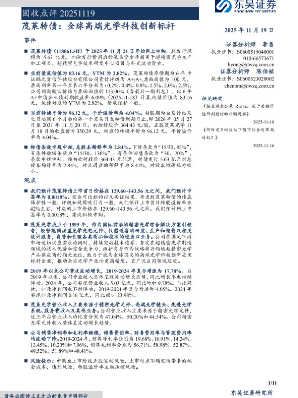 【东吴证券】【202511】固收点评:茂莱转债,全球高端光学科技创新标杆-11页