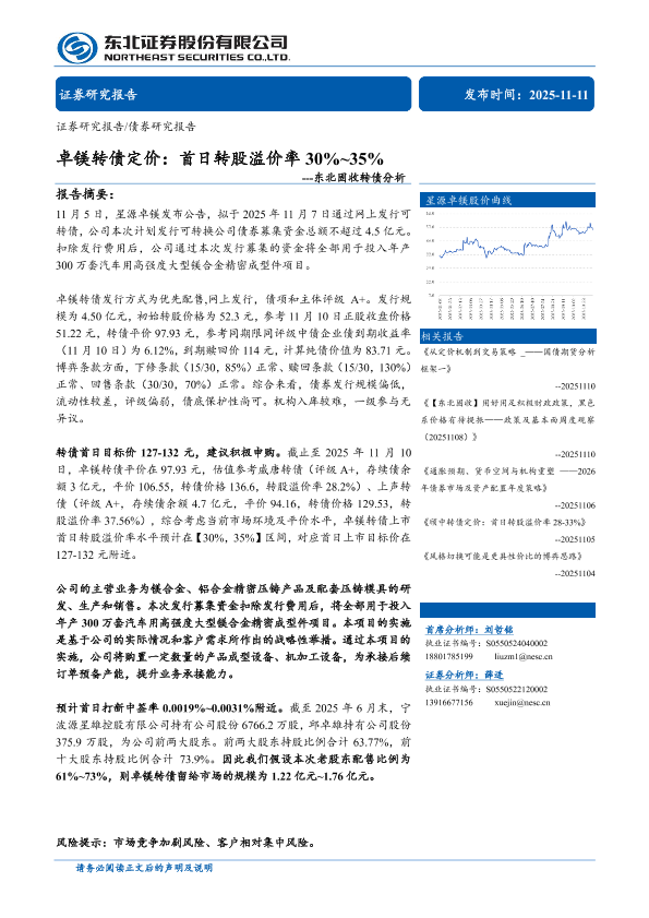 【东北证券】【202511】卓镁转债定价:首日转股溢价率30%~35%-11页