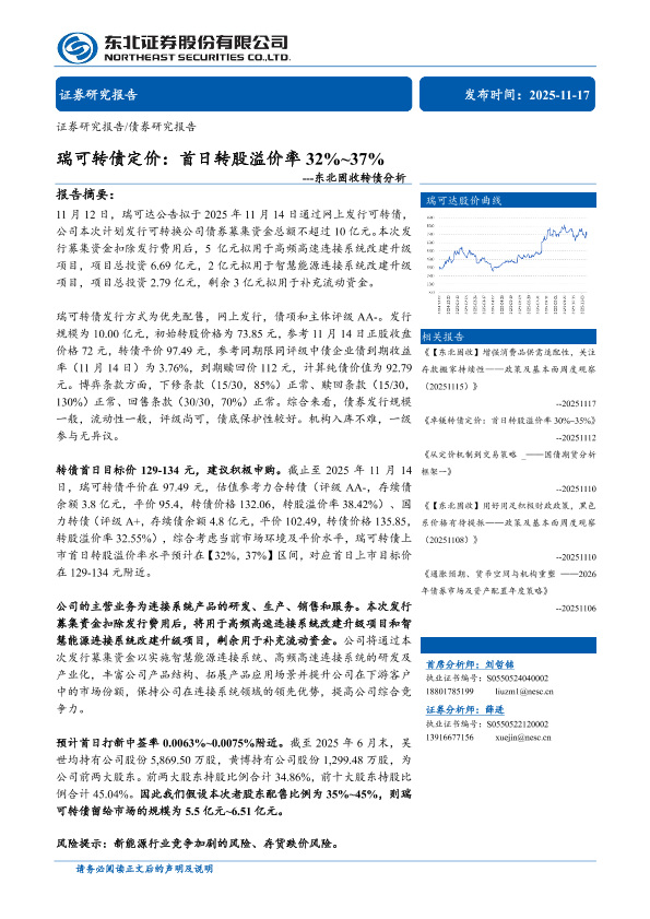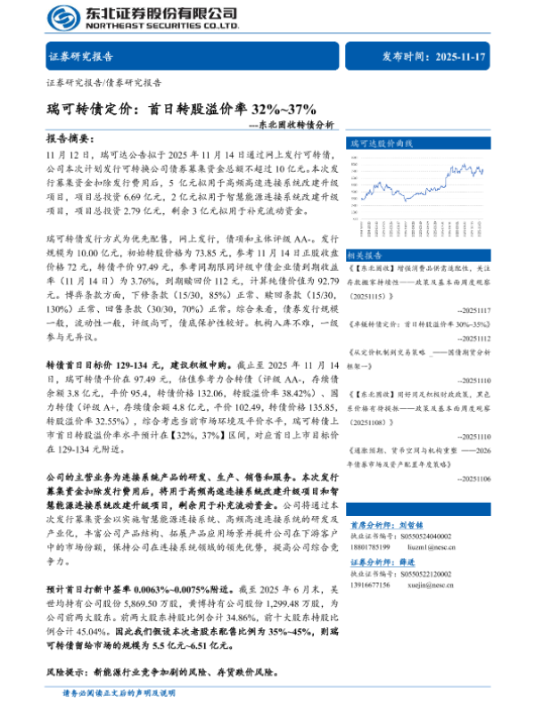 【东北证券】【202511】瑞可转债定价:首日转股溢价率32%~37%-12页