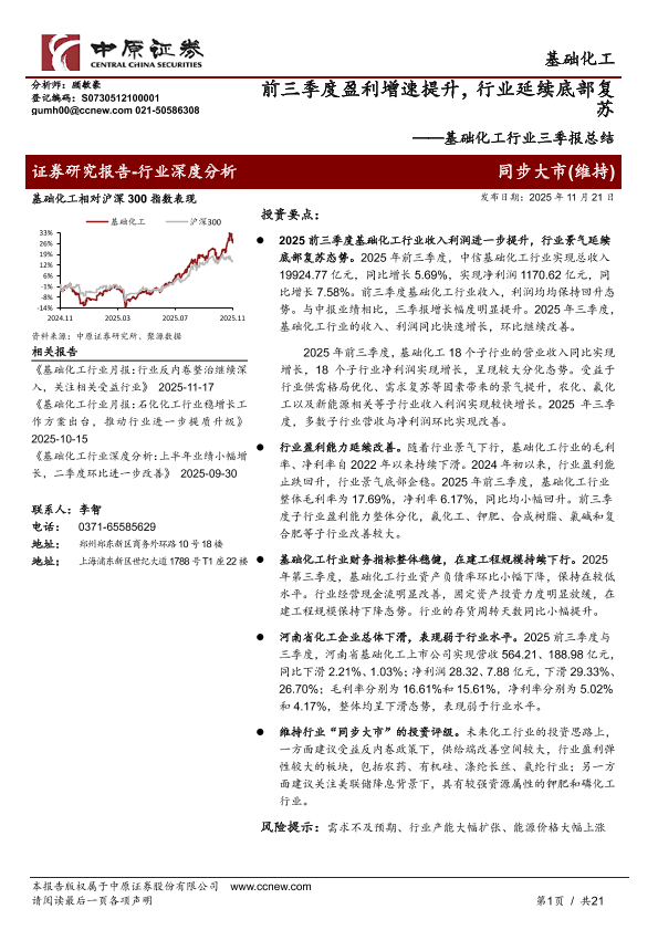 【中原证券】【202511】基础化工行业三季报总结:前三季度盈利增速提升,行业延续底部复苏-21页