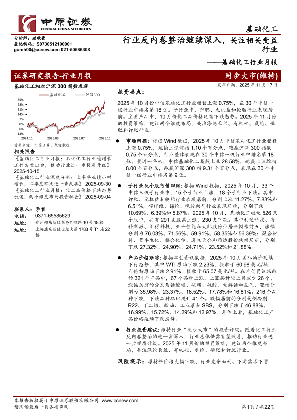 【中原证券】【202511】基础化工行业月报:行业反内卷整治继续深入,关注相关受益行业-22页