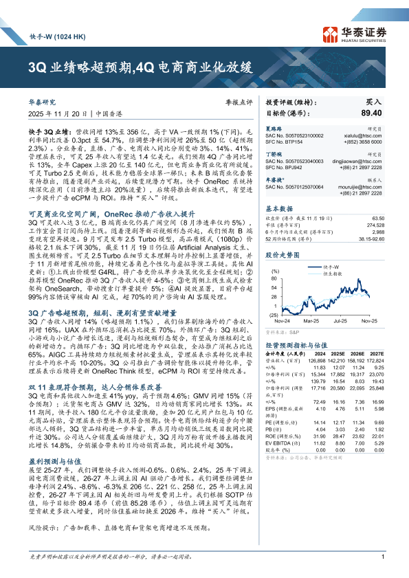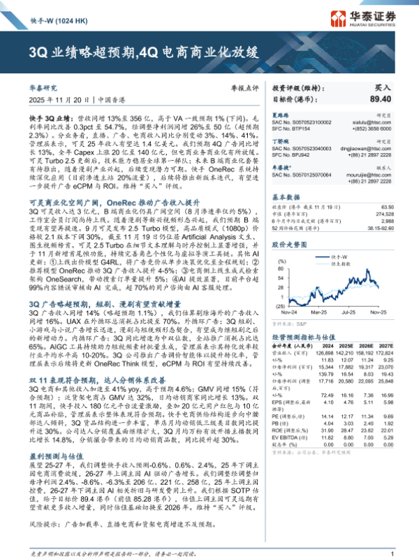【华泰证券】【202511】快手-W(1024 HK)3Q业绩略超预期,4Q电商商业化放缓-11页