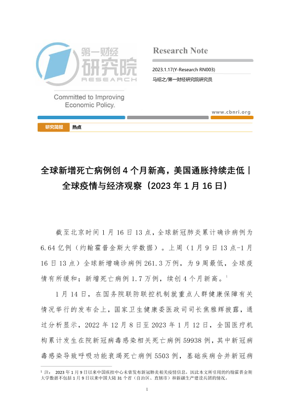 【第一财经研究院】【20230116】全球疫情与经济观察:全球新增死亡病例创4个月新高,美国通胀持续走低-21页