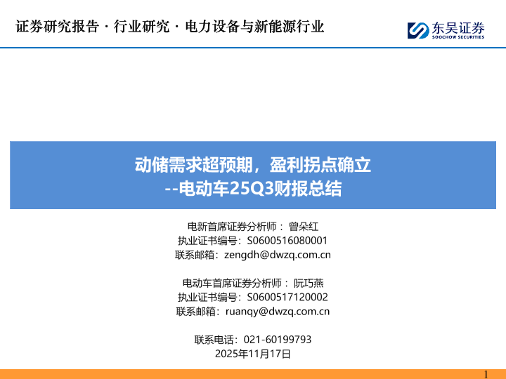 【东吴证券】【202511】电动车25Q3财报总结:动储需求超预期,盈利拐点确立-80页