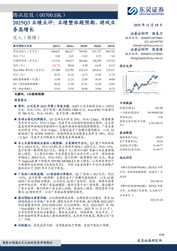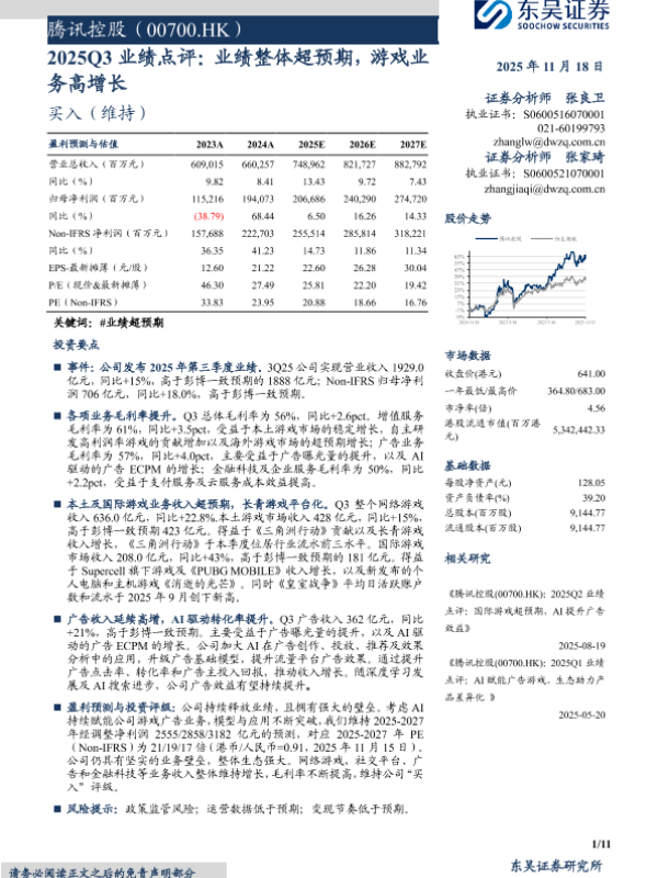【东吴证券】【202511】腾讯控股(00700.HK):2025Q3业绩点评:业绩整体超预期,游戏业务高增长-11页