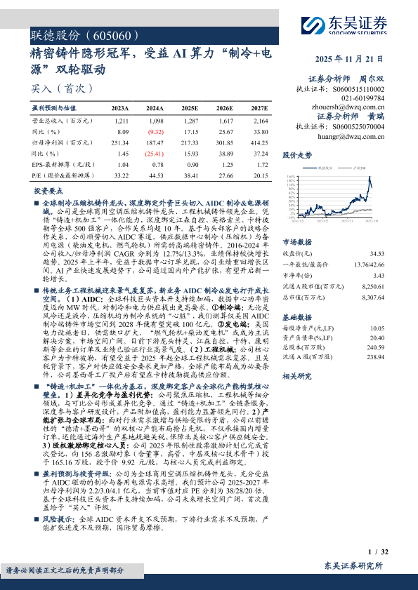【东吴证券】【202511】联德股份(605060)精密铸件隐形冠军,受益 AI算力“制冷+电源”双轮驱动-32页