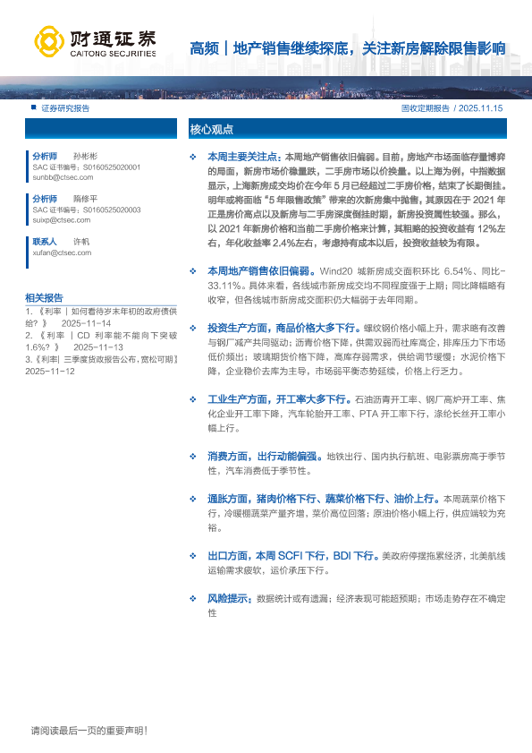 【财通证券】【202511】高频|地产销售继续探底,关注新房解除限售影响-14页
