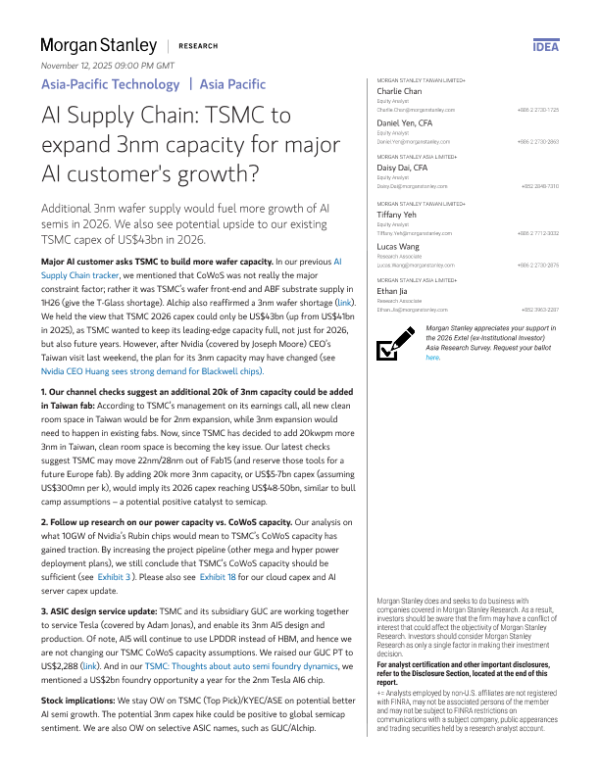 【Morgan Stanley】【2025】AI Supply Chain TSMC to expand 3nm capacity for major Al customer's growth?-20页