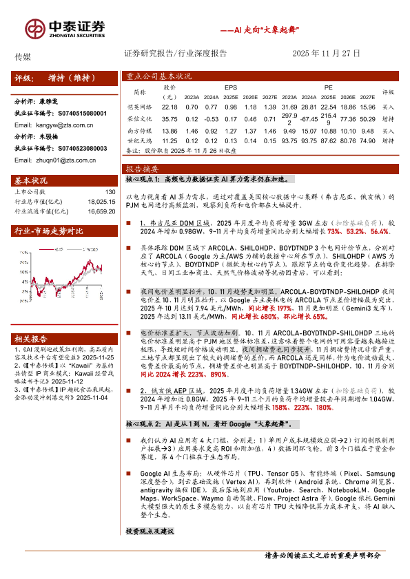 电力负荷 Google生态 AI算力需求 传媒行业 数据中心