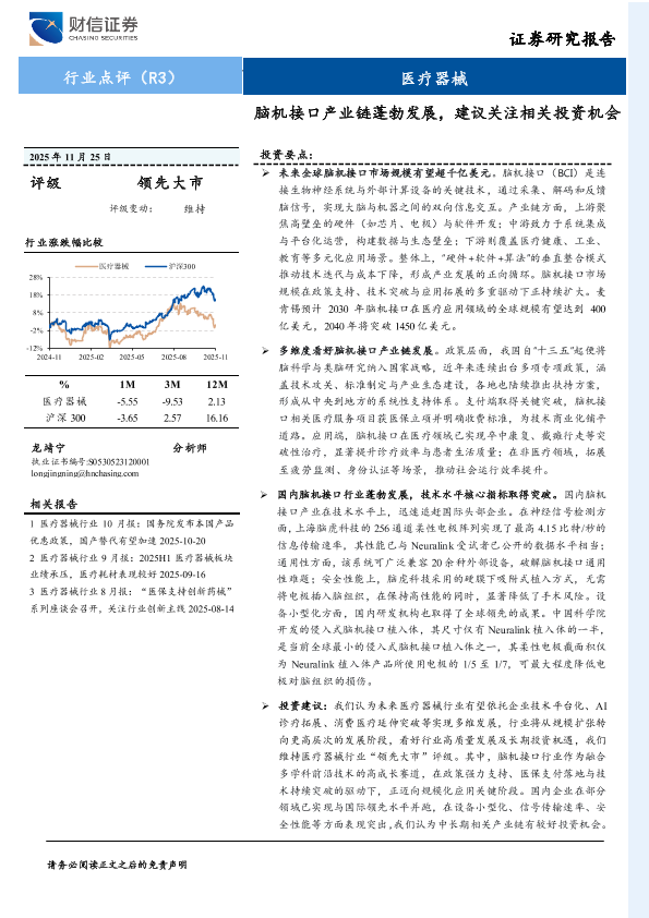 【财信证券】【202511】医疗器械行业点评:脑机接口产业链蓬勃发展,建议关注相关投资机会-10页