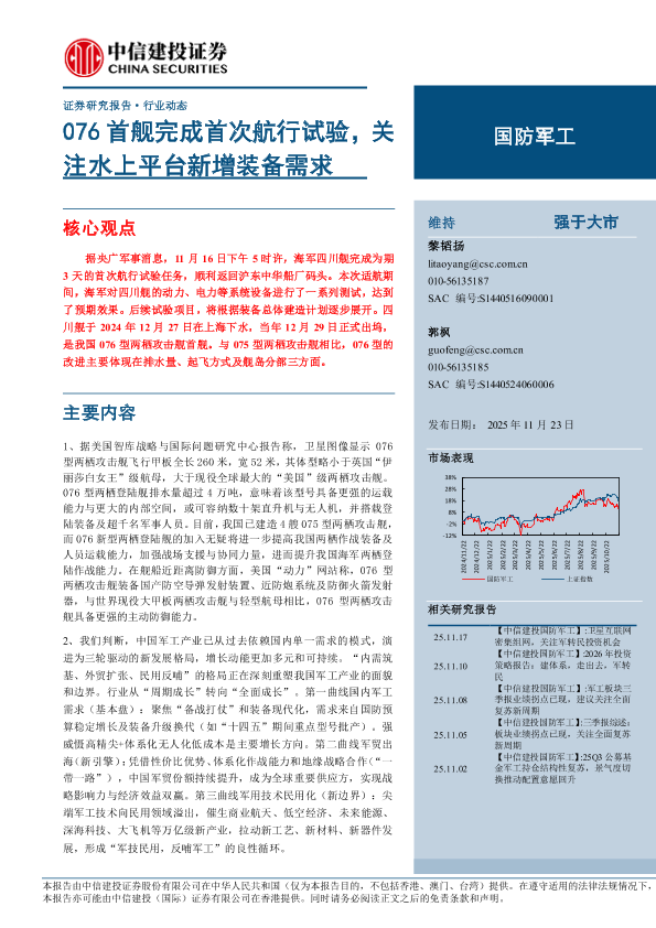 【中信建投证券】【202511】国防军工行业:076首舰完成首次航行试验,关注水上平台新增装备需求-22页