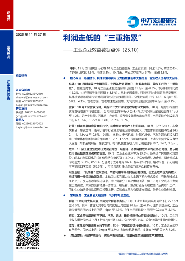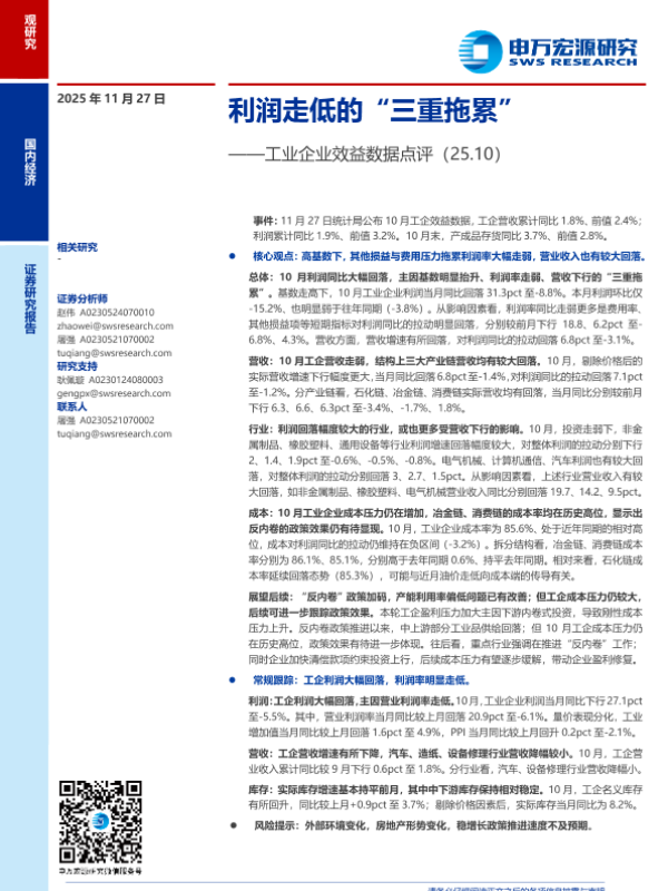 【申万宏源】【202511】工业企业效益数据点评(25.10):利润走低的“三重拖累”-10页