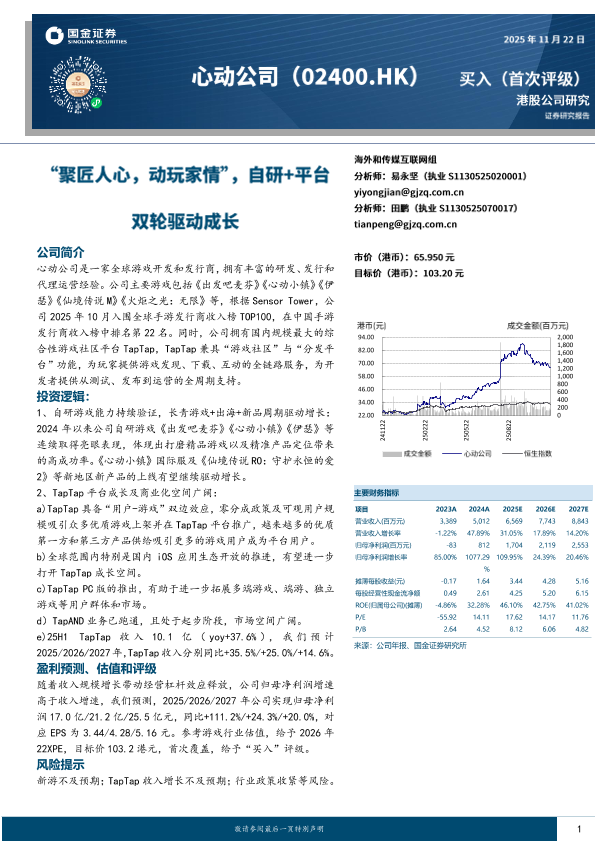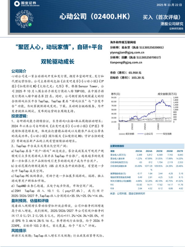 投资评级 TapTap平台 游戏公司 盈利预测 自研游戏