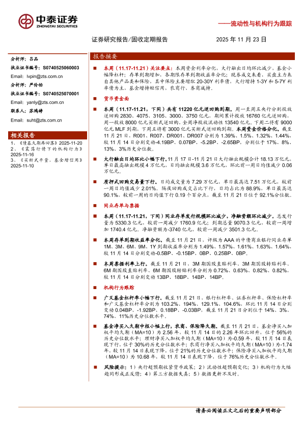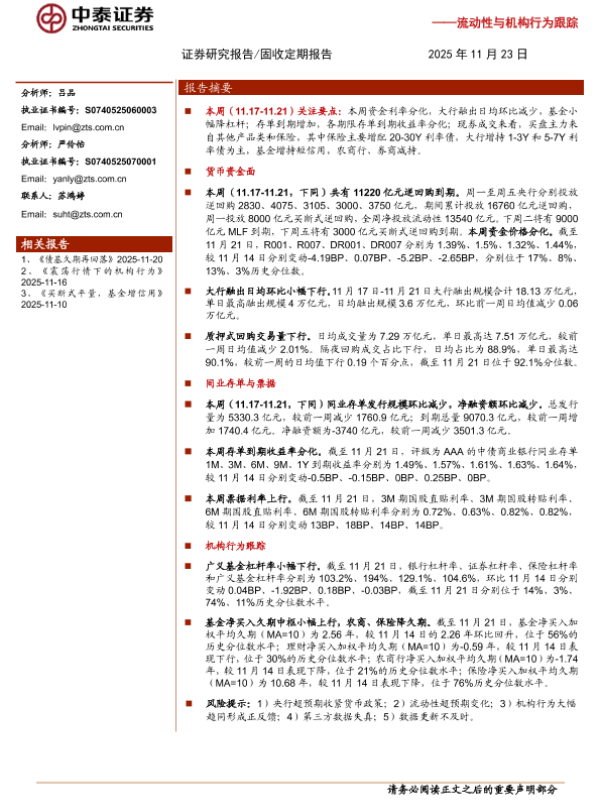 【中泰证券】【202511】流动性与机构行为跟踪:资金波动,大行融出下行-12页