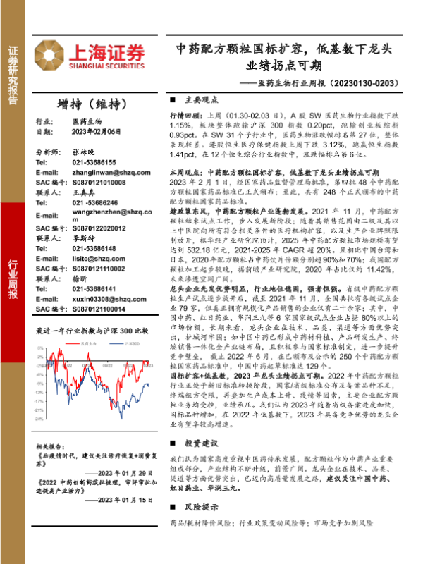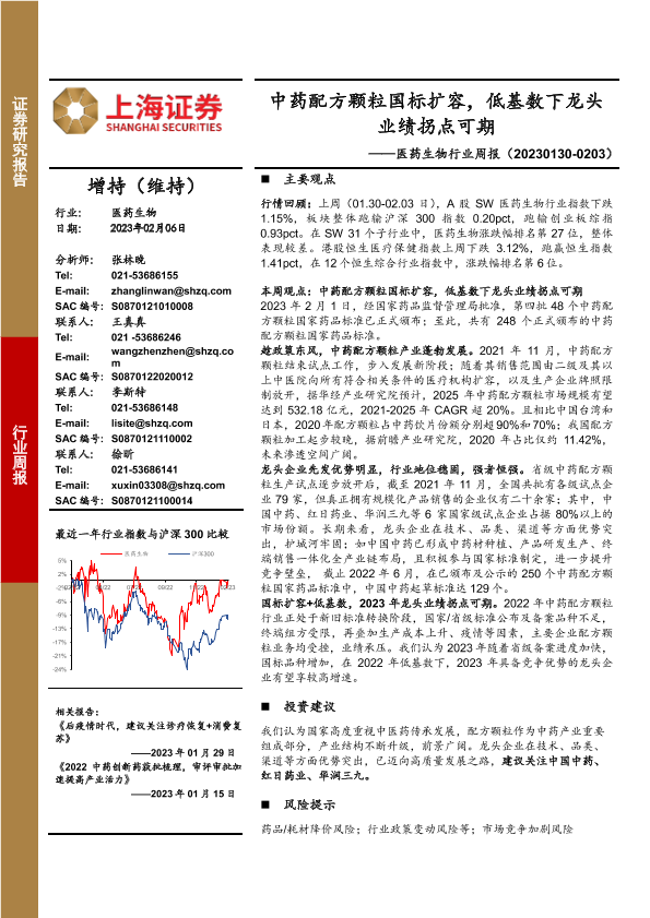 【上海证券】【20230206】医药生物行业周报:中药配方颗粒国标扩容,低基数下龙头业绩拐点可期-22页