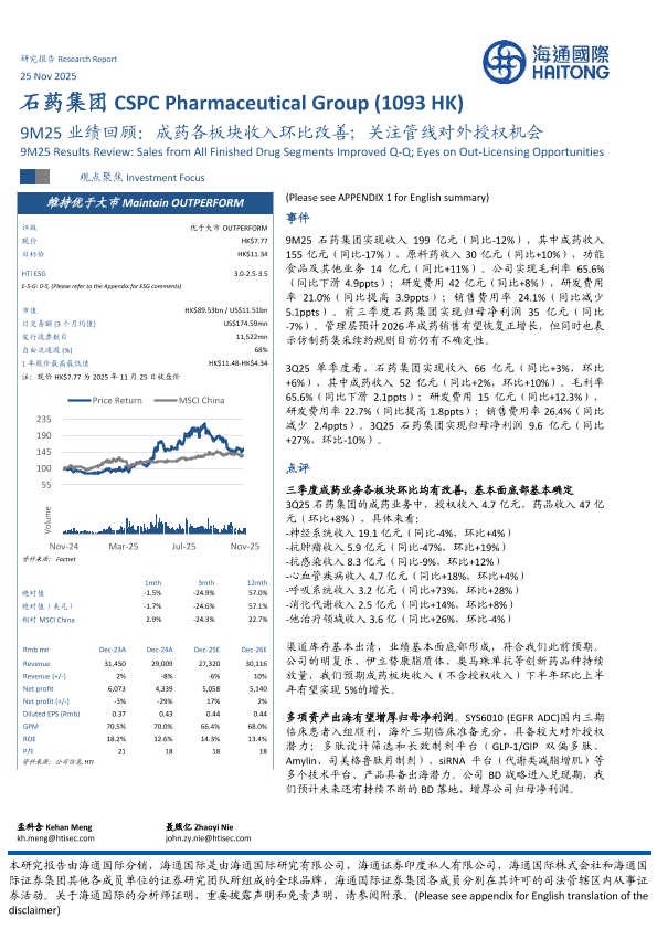 【海通国际】【202511】石药集团(1093 HK)9M25业绩回顾:成药各板块收入环比改善;关注管线对外授权机会-14页