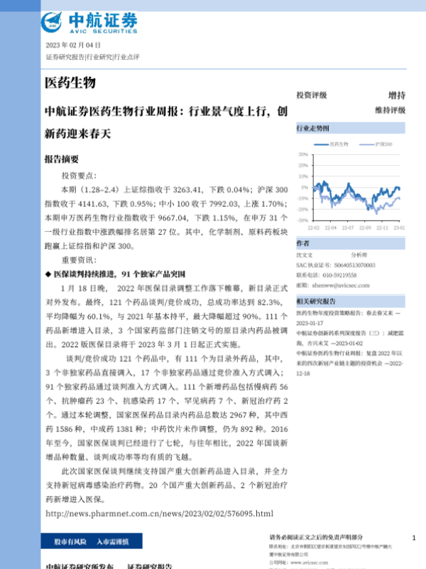 【中航证券】【20230204】医药生物行业周报:行业景气度上行,创新药迎来春天-21页