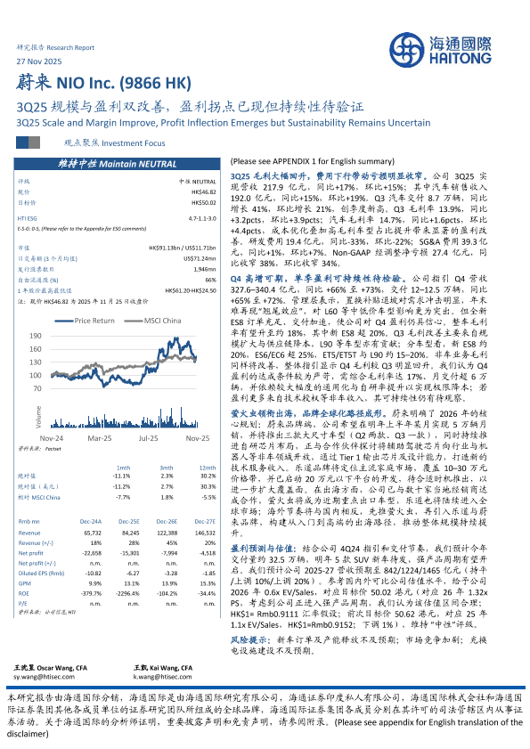 【海通国际】【202511】蔚来(9866 HK)3Q25规模与盈利双改善,盈利拐点已现但持续性待验证-12页