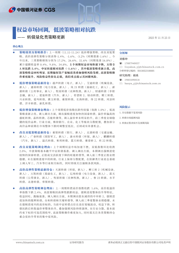 【银河证券】【202511】转债量化类策略更新:权益市场回调,低波策略相对抗跌-11页