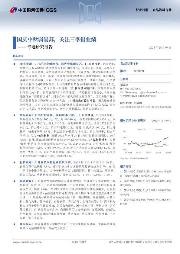 国庆出行 餐饮供应链 原料成本 顺周期复苏 白酒