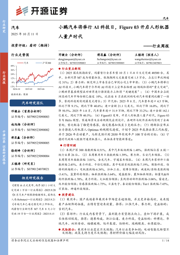 【开源证券】【202510】汽车行业周报:小鹏汽车将举行AI科技日,Figure 03开启人形机器人量产时代-14页