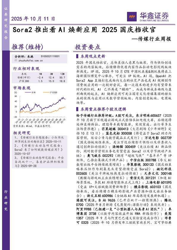 AI应用 国庆档电影 IP经济 传媒行业 Sora2