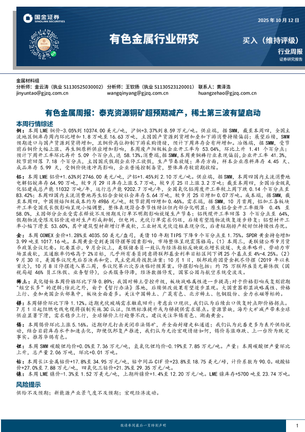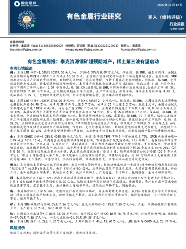 【国金证券】【202310】20251012-国金证券-有色金属周报:泰克资源铜矿超预期减产,稀土第三波有望启动.pdf-16页